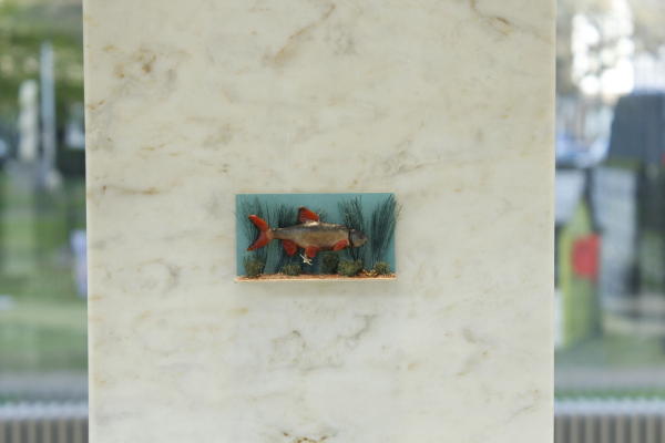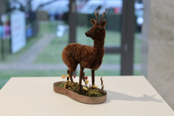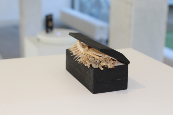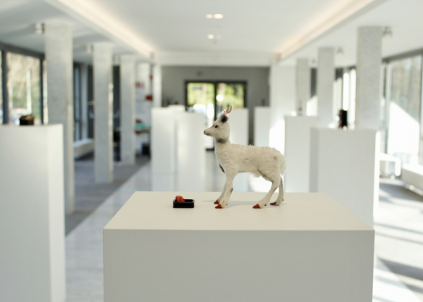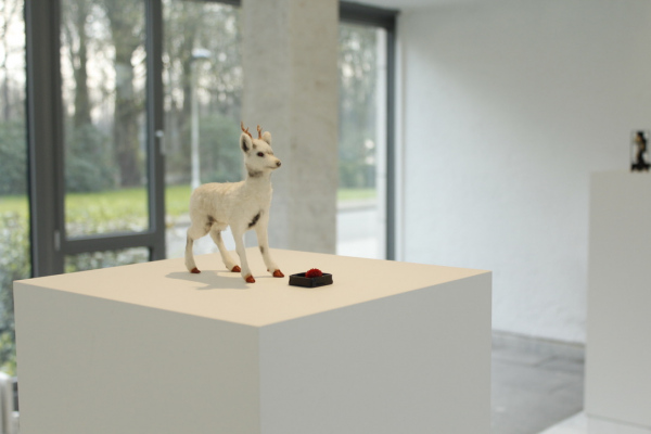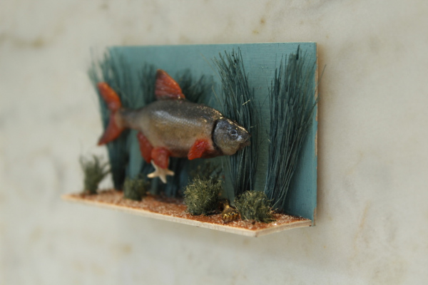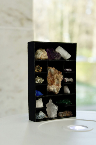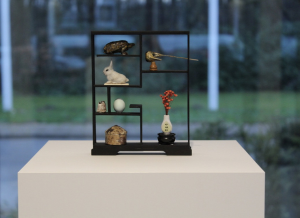 Les Cabinets du Corridor is an installation with several miniature cabinets housing collections of eclectic specimens. These are like small 'Wunderkammers' of cabinets of Wonder. The cabinet of Wonder is a tradition that originated in the sixteenth century. In these collections; the real object was very difficult to distinguish from the fake, man made object. Naturalia like bones, shells and taxidermy were juxtaposed to fictional oddities. By playing with the scale of these objects a miniature microcosm is created. Japanese inspired objects like bonsaï trees, suiseki stones and ikebana flower arrangments reside next to specimens from the natural world. The visitor is invited to take a closer look at these artifical scenery and distinguish the real specimens from the fictional.