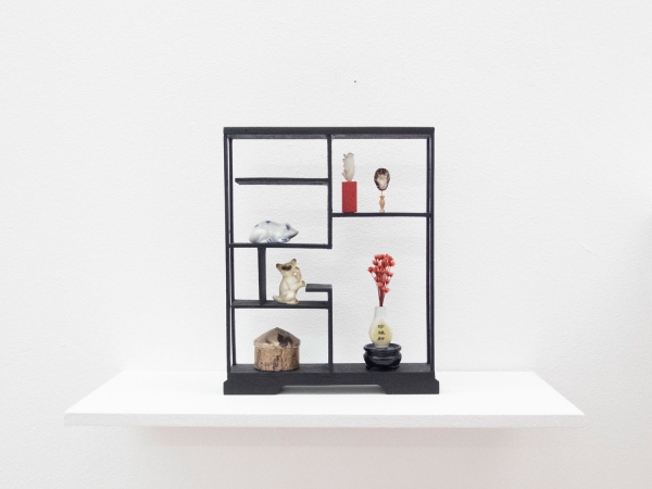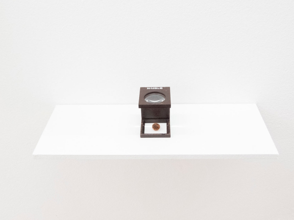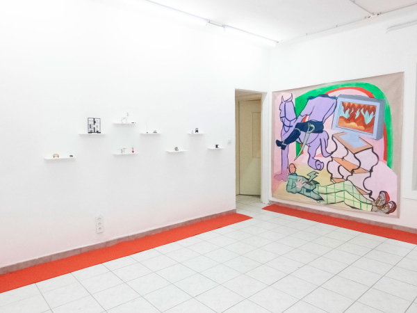 Paintings by Ines Claus, magnifier and installation of miniature works by Romane Claus.